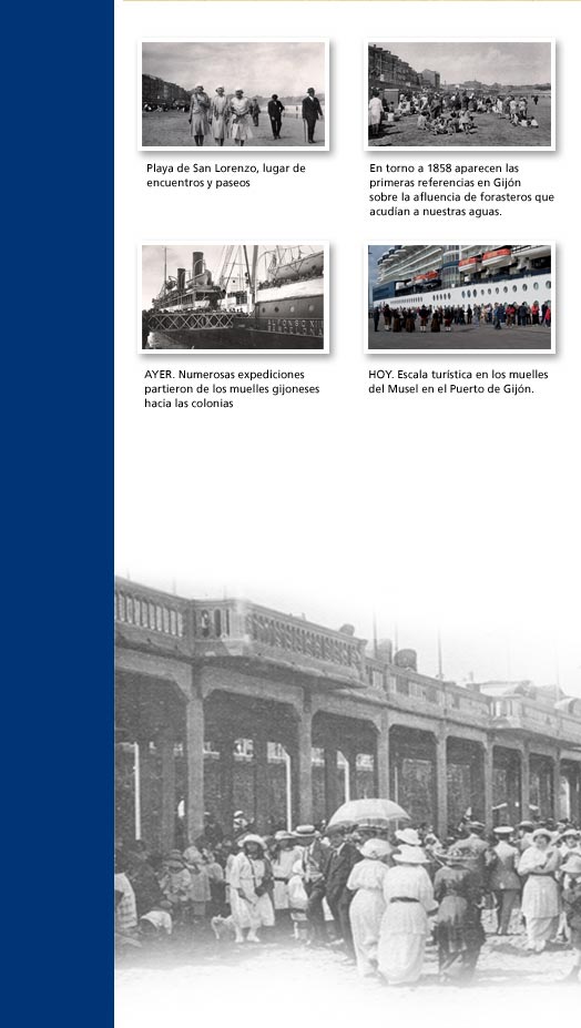 Desde un punto de vista turístico, la realeza y la burguesía gestaron, durante el siglo XIX, una realidad ligeramente cosmopolita de la ciudad, generando negocios propios en torno al pasaje. Fondas, hoteles y restaurantes fomentaron un primigenio sector hotelero y hostelero afrancesado, muy al gusto de la época. En torno a los años dorados de la marina romántica, entre 1840 y 1880 –aunque también antes y hasta después de la Guerra Civil–, partían numerosas expediciones, vinculadas a las colonias, desde los muelles gijoneses. Aquellos enormes buques de vela despertaban expectación y asombro y exigían el conveniente pertrecho para abordar con éxito una travesía de 45 a 60 días. Esta exposición recoge también el gusto por los baños de ola en el litoral gijonés. Las primeras referencias que existen en Gijón sobre la afluencia de forasteros que acudían a nuestras aguas, las tenemos en torno a 1850. Será, sobre todo la playa de Pando –con una magnífica orientación sur y cercana a Jove, zona residencial de la alta burguesía local– dónde se establecen las primeras casetas rodantes para servir al bañista durante su estancia en la playa. Allí acudirá la reina Isabel II, a pasar la temporada de baños, en el verano de 1858, en el marco del viaje oficial a Asturias y Galicia. La playa de San Lorenzo quedaba para los paseos ya que, por su oleaje era considerada peligrosa. Ligada a esos andares, la calle de Corrida o el paseo de Begoña, que serán, desde entonces y hasta hoy, piezas fundamentales para el dejarse ver y también para el encuentro. |